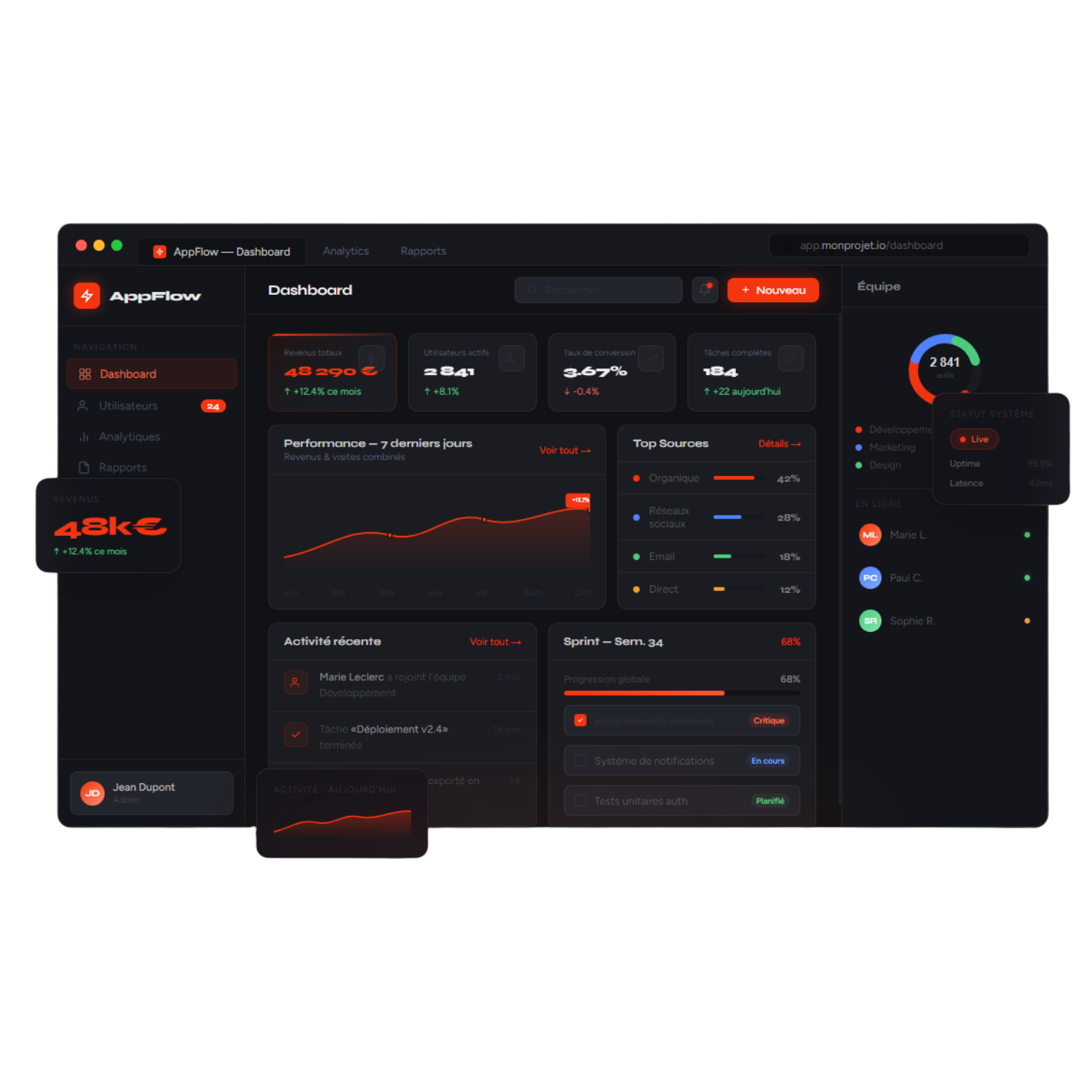 Pour des projets plus avancés, je développe des applications entièrement autonomes avec React JS et un back-end sous Node.js. Le code est versionné sur GitHub, garantissant une collaboration fluide et une maintenance simplifiée. Chaque application est déployée sur Vercel pour assurer rapidité, scalabilité et performance optimale.